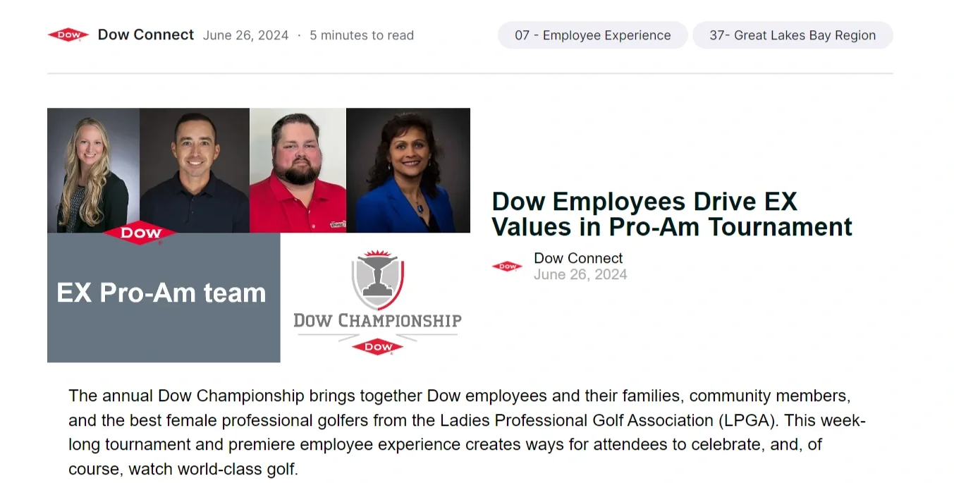 Dow Championship Pro-Am team members were selected by their bosses for exemplifying Employee Experience values. To spotlight these employees, promote Employee Experience and generate excitement for the Pro-Am tournament, I interviewed the four Pro-Am team members, gathered quotes and wrote a feature piece which was published on Dow’s intranet. This article was visible to more than 400 unique viewers.